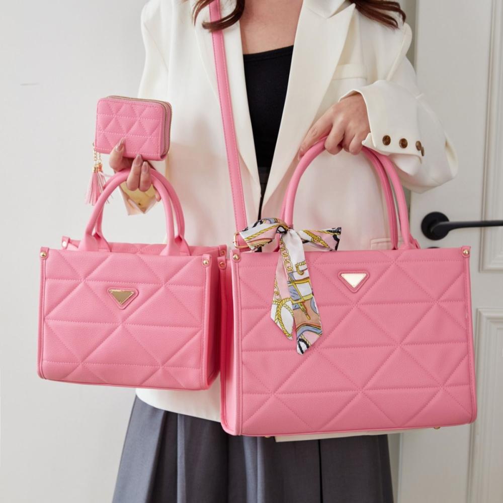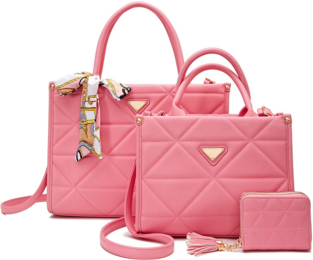 Turn heads this season with our stunning 3-piece pink designer handbag set. Featuring two chic quilted handbags and a matching wallet, this set blends fashion with function. The playful printed scarf detail adds a touch of sophistication, while the spacious interiors and versatile straps make it perfect for work, school, or weekend outings. Whether you’re running errands or stepping into an important meeting, this eye-catching set ensures you carry your essentials in style.